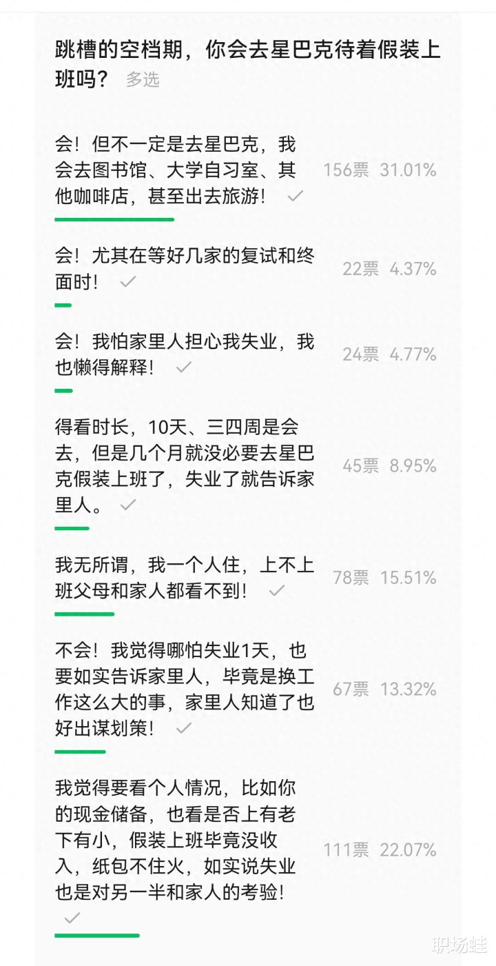 现在就问你:在跳槽的职业空档期,你会去星巴克等场所待着假装上班吗?请你点选一下,帮人也是帮自己,看下谁的想法跟自己一样!